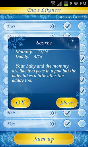 通過了所有步驟後,直徑的肖像將結束你的寶寶類似於考慮到你的答案。您將能夠與你的親人和朋友,通過Twitter,Facebook和谷歌+,e-mail和短信分享成果。