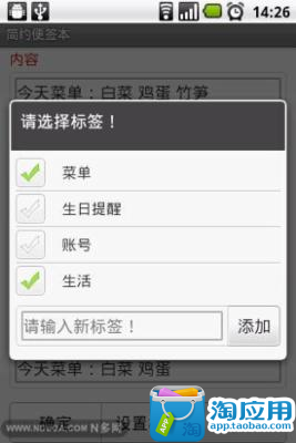简约便签本[1.0] 简约记事本生活中的小便签,不但有普通的记事功能,还有加密、标签分类、提醒、通过短信分享还有一款很萌的桌面 widgt。用起来不但方便而且功能强大。