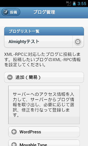 このアプリは、「XML-RPC」というプロトコルを使用して投稿を行いますので、「XML-RPC」に対応したブログ(サービス)で利用できます。