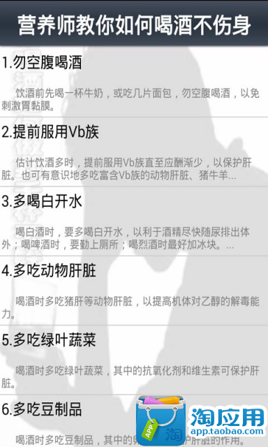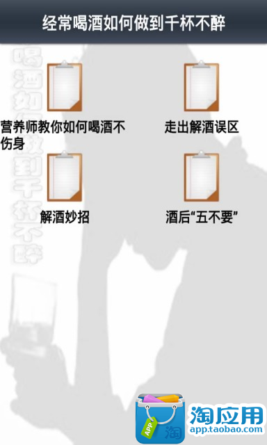 俗话说:人在江湖身不由己。驰骋在商场上的人士更是免不了要经常在外应酬。吃饭时,为了调节气氛实在不想喝酒也得硬着头皮喝上几杯,如何才能不醉酒呢?喝酒后如何正确解酒呢?本应用就为大家介绍经常喝酒如何做到千杯不醉。