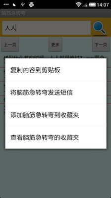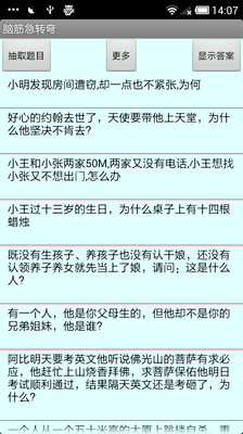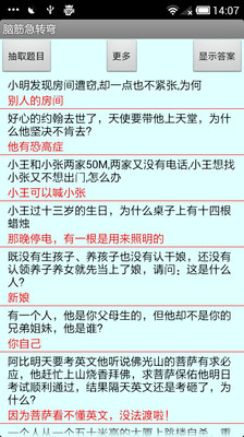 这是一款基于ANDROID系统的脑筋急转弯离线查询系统,包含了3600条常见的脑筋急转弯,是您无聊时开心的小玩意,也是逗女朋友开心的好帮手