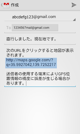 GPSにより緯度と経度の位置情報を取得し、その情報をGoogle Mapで表示するURLが記載されたメールを作成できます。