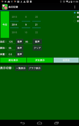 週平均は朝昼夜別に算術平均となります。メニューからグラフ