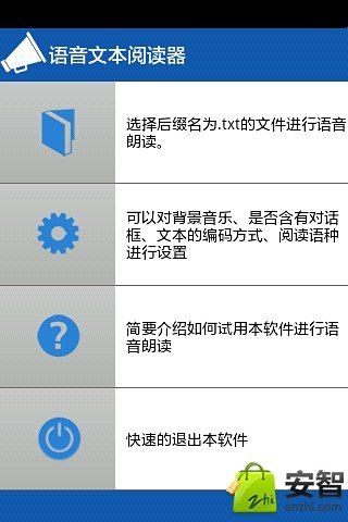 本软件提供英语,普通话,粤语,湖南话,陕西话等方言来阅读您的sd卡中的txt文本文件,如果你是小说爱好者,英语爱好者,好学者,将自己喜欢的内容写到txt文本文件保存到sd卡,用自己喜欢的家乡话来阅读以上内容,是不是很拉风啊?还等什么,赶快下载本软件吧.