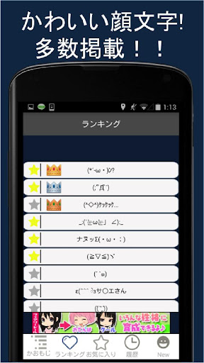 もちろん可愛い顔文字やシンプルなかおもじなど「顔文字」の総数は約1万2千点集めた顔文字辞典アプリです!!