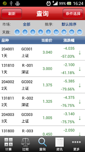 查询信息:拥有沪深两市所有逆回购的即时数据,提供市场、天数的筛选,以及涨跌幅、当前价格的排序。详细信息中提供当日最新逆回购信息,并有日K线提供参考。