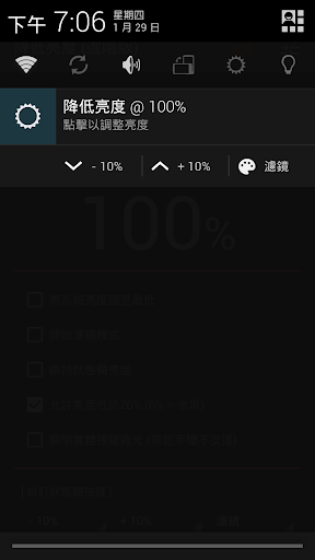 *亮度降低程度可調整至比原廠最低值還低, 若調的太暗, 按音量鍵即可復原(此功能限設定視窗內使用)。