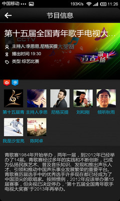 2、最迅捷的信息来源。青歌赛客户端同步弹出节目中提到的关键词实现电视内容的扩展阅读。无论新闻、视频、图片给你最全面最细致的CCTV青年歌手电视大奖赛;