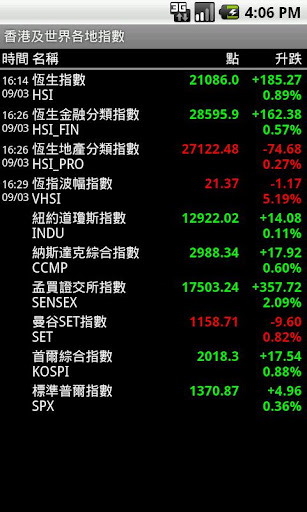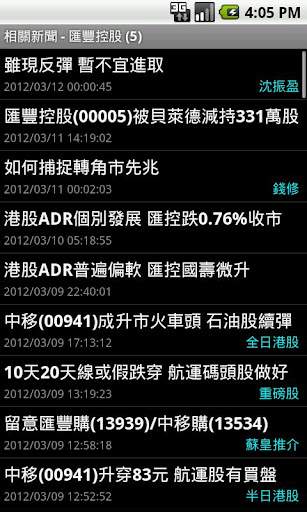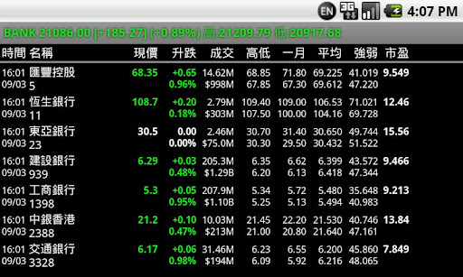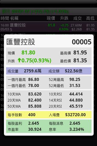 功能及操作﹕大或小字型風格顯示。旋轉螢幕顯示更多資訊。標題列顯示恒生指數。圖表分析顯示一日、三日、十日、一月、三月及一年移動平均線+成交量+陰陽燭圖。自訂股票組合分類,支援觸控左右滑動切換組合。快捷工具列。