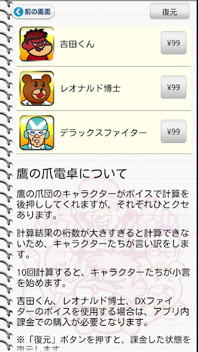 ※購入画面の「復元」ボタンを押すと、課金した状態を復元します。