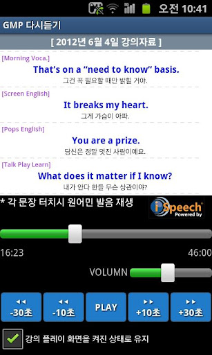 그날의 주요 문장을 플레이화면에서 모두 보여주어 책을 볼 수 없는 상황에서도 화면에 나온 문장을 보면서 공부 할 수 있습니다.