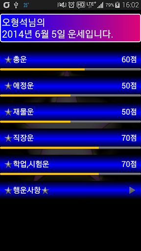 * 오늘의 운세 : 생년월일과 이름을 등록 하시면 사주팔자에 따른 매일의 운세를 배달 받으실 수 있습니다.