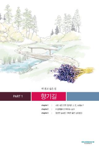 한국에서 걷고 싶은 아름다운 길을 소개하는 책입니다. 듀오백코리아가 제작한 책을 앱으로 만든 것으로 향기길, 노래길, 연인길, 문학길, 영화 &드라마 길이라는 주제로 아름다운 길을 소개하고 있습니다. 더불어 올바르게 걷는 방법에 대한 소개와 건강하게 앉아 있는 방법에 대해서도 소개합니다