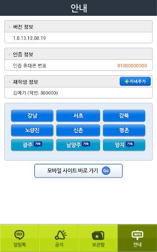 메가스터디학원 재원생 및 재원 중인 자녀의 학원 출결현황을 모바일에서 확인할 수 있는 메가스터디학원 전용 어플리케이션입니다.