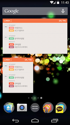3. 위젯의 식단 부분을 터치하면 현재 시간대에 맞는 식단을 서버로부터 수동으로 갱신합니다.(갱신은 자동으로 매일 새벽 1시에 이루어집니다)