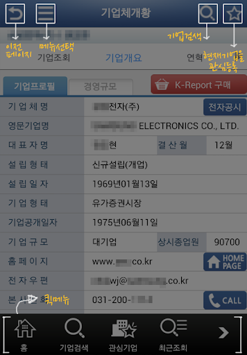 - 기업정보 : 기업브리핑, 개황정보, 경영진정보, 주주현황, 사업현황, 영업현황, 재무제표