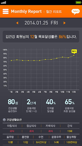 - 월별 목표달성률, 운동진행 단계, 건강생활습관 개선사항, 운동 다이어리, 건강평가, 혈압 데이터 확인 가능