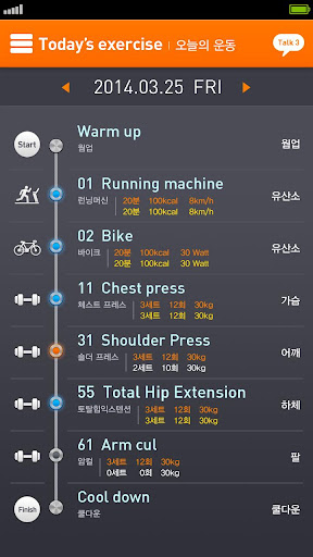 - 오늘의 운동 가이드 제공(웜업, 유산소, 부위별 웨이트 트레이닝, 쿨다운)