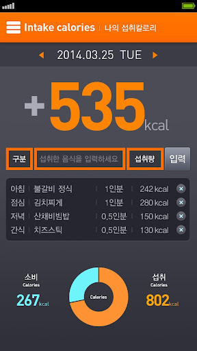 - 식단 다이어리 관리 기능(섭취칼로리, 소모칼로리)