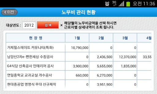- 노무비관리현황 : 월별,현장별 노무비관리 현황을 한눈에 확인