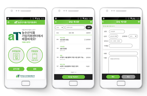 식품외식 관련하여 고민이 있으신가요? 한국농수산식품유통공사(aT) 기업지원센터는 모바일 어플로 식품·외식기업의 고민을 빠르고 시원하게 해결해 드립니다. 판매/수출, 경영, 안전/위생, 제조/가공, 일반소비자, 기타상담 등 식품외식 관련 어떠한 애로사항이든 자유롭게 남겨주시기 바랍니다.