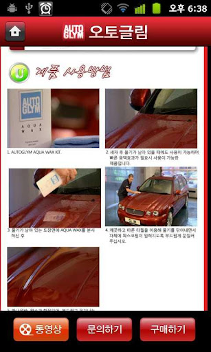 자동차의 부위로 외장, 유리, 엔진룸, 휠, 실내 등 제품의 사용 설명과 동영상을 제공합니다. 또한, 전문가와의 상담 기능까지 제공하는 편의 어플리케이션입니다.