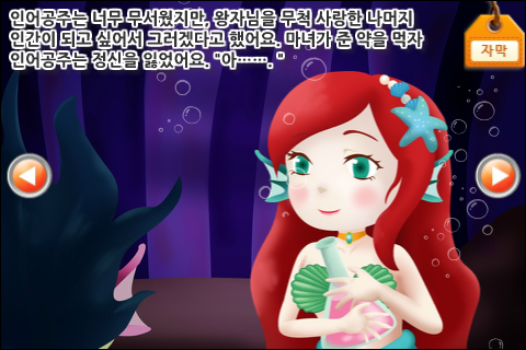 유아 동화 앱북 인어공주는 기존의 플레이 방식의 보기만 하는 동화가 아닌 아이들이 직접 스토리 진행에 참여하도록 유도 하는 인터렉티브 동화 어플리케이션 입니다.