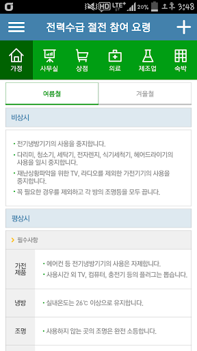 가정, 사무실, 상점, 의료, 제조업, 숙박시설의 여름철, 겨울철 절전 참여 요령 정보 제공