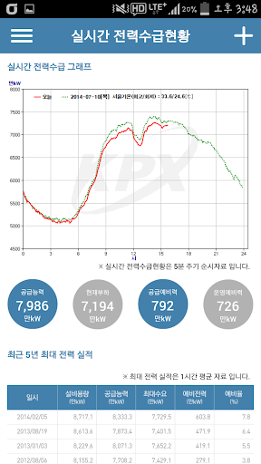 공급능력, 현재부하, 공급예비력, 운영예비력에 대한 정보와 실시간 전력수급 현황 그래프 제공