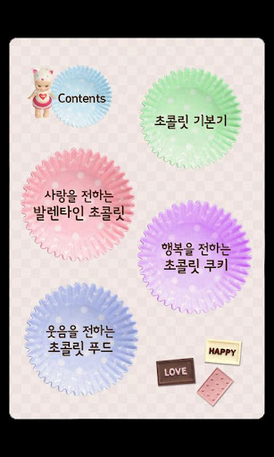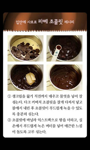 초콜릿에 대한 모든 레시피는 다 담았다! 초콜릿 레시피는 물론, 초콜릿 쿠키, 초콜릿 브라우니, 초콜릿 머핀, 초콜릿 케이크까지. 어플 하나에 없는게 없다! 초콜릿을 위한 맞춤 포장법은 보너스~!