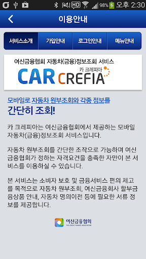 카 크레피아는 여신금융협회에서 제공하는 모바일 자동차(금융)정보조회 서비스입니다.