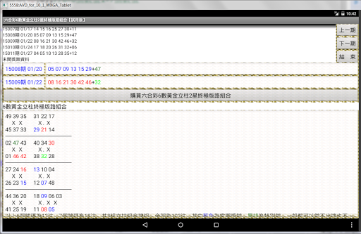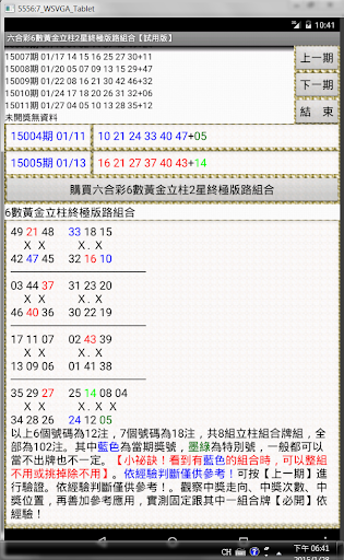 所謂6數2星說明:6個號碼以立柱3數X2列共6個號碼再搭配獨特特殊金財神爺算試組合2星而生成的號碼組合。可大大提高中獎機率的好用軟體【金財神爺出品必屬佳品】本試用版限制為按【下一期】只能到獎號前三期止,無法按到當期。主旨為可按【上一期】向上比對歷史以黃金立柱終極版路效果之用。意者請支持正版購買六合彩6數黃金立柱2星終極版路組合。展示畫面為【黃金立柱終極版路】畫面。自動更新獎號隨開即可參考期期都可比對結果,操作簡單易懂並結合特殊立柱版路專攻二星用戶設計出好用軟體。