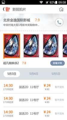 根据您的位置快速定位,获取周边相关影院的排期和票价,影院信息尽在掌握;