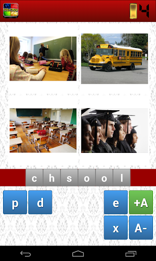 You are presented with 4 pictures, that have something in common: from colour, to scene. Everything counts in the pics. You are presented also with 10 letters, but few of them all wrong - You have to compose correct word from letters. When You guess What is in pictures, You are rewarded with Gold!!!