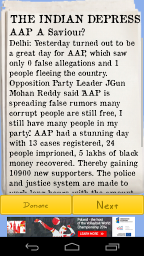 The Aam Admi Party has had a stunning debut in Delhi and is ready to take on the national elections in India. Join them in AAP : The Sweeper by sweeping the streets of the major cities in India.Sweep away the dishonest politicians and corrupt bureaucrats to jails and court all the while making sure that you don't let them escape the country via airports.Read about you performance in the dynamic game end newspaper. Stay true to your name by avoiding sweeping of civilians.Recruit honest politicians to join your cause and thereby unlock new cities. Gain support of voters to spread your influence all out India and fight at the national level. A special tutorial told via Arvind Kejriwal helps you get familiarize with the game. After that get ready to take on politicians like Narendra Modi and Rahul Gandhi.Help Aam Admi Party overthrow established parties like Congress, BJP.
