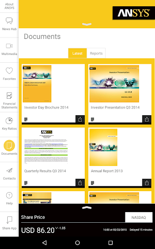 ANSYS IR app allows users to get the latest share price information, press releases and easy access to ANSYS product information. It also enables the reviewing of financial reports, presentations, as well as video and audio material both online and offline.