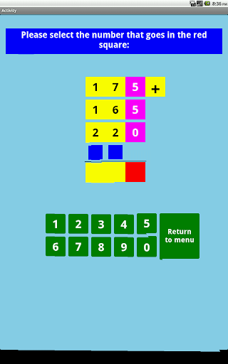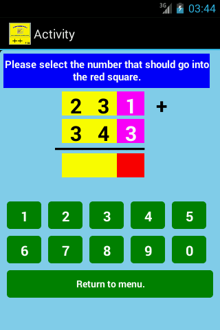 The practise sessions in Addition Double Digit are randomly generated however they are generated within strict parameters to ensure the sessions remain within the users capabilities. The "practise" sessions will continue to provide an unlimited number of exercises until the user chooses to return to the menu.