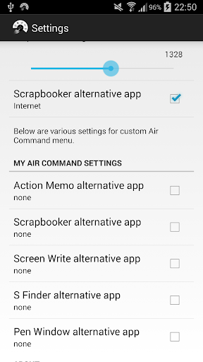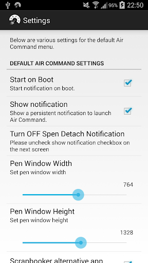 Some info on the default Air Command: Action Memo, Screen Write, S Finder and Pen Window can be launched with a finger click but Scrapbooker - due to how it was designed - still needs the spen to draw a target window. When the spen is detached and you click Srapbooker, the app informs you to use the spen to draw the target window. However, if the spen is inserted and you click Scrapbooker, Snote will be launched instead. You can replace that in the settings panel. The settings panel has option to set Pen Window size but if you bought my other app Pen Window Launcher, then the will launch that instead when you click the Pen Window menu item of the default Air Command.