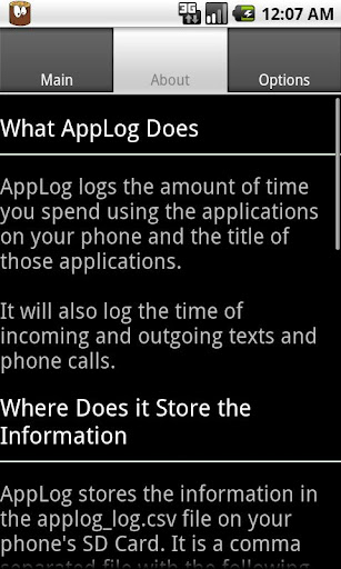 AppLog keeps a log of the titles of the applications that a user uses, all of the times of their texts and phone calls. It can be used to track your own usage, your childs usage, or for any kind of study to see how people use their smartphones!