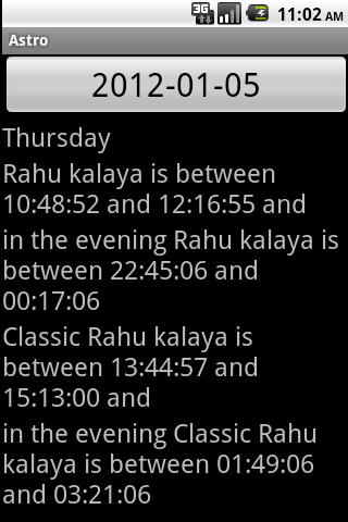 -Planetary hour owners (hora) and Rahu Kalaya for any date with user-friendly indication of what the best activity to engage in during each astrological hour. This is calculated from sunrise to sunset. Rahu Kalaya is a period which overlaps one or more hours (generally 1.5 hours) and is inauspicious for doing things. This application calculates Rahu Kalaya correctly based on astronomical principles. Classic Rahu Kalaya indicates the common accepted time ranges, however this is incorrect.
