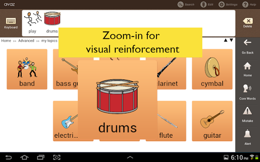 Avaz uses picture symbols and high-quality voice synthesis to help users create messages. It comes with 3 research-based, graded picture vocabularies, and a Core Words set that will help a child begin to communicate. These vocabularies have been designed to facilitate spontaneous novel utterance generation, encouraging a child to not only use language, but also generalize from it.