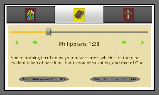 Various modes of the app can be easily accessed by simply clicking the tabs on the top. With a single click, you have the options to move conveniently back and forth from verse to verse, from chapter to chapter, or go to any part with a sliding bar.