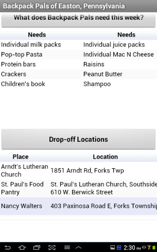 This app is only useful to people living in the Easton area of the Lehigh Valley of Pennsylvania. The app allows donors to know (while shopping) what food items are currently needed by Backpack Pals of Easton. Donors can then buy and donate them to Backpack Pals. It also provides locations and times of drop-off sites and a list of upcoming related events.