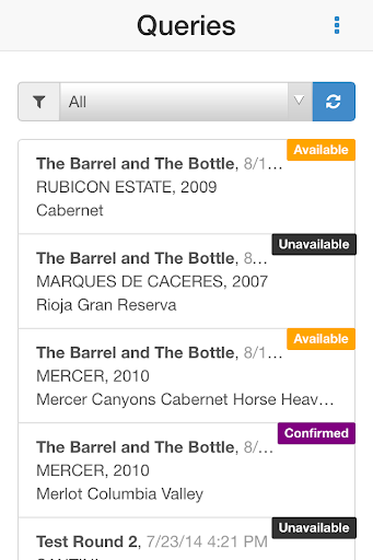 BevQuery allows beer and wine retailers to determine the availability of specific products in their location by submitting queries. Queries cross reference a database that uses the retailer's location to determine which, if any, distributor carries the brand a retailer (or their customer) is looking for. If a distributor is registered to carry the brand, BevQuery allows the retailer to input specific information about the wine (vintage, variety, etc.) and transmits the query to a distributor's representative who then responds via the software with inventory availability. Use of BevQuery requires pre-registration at BevQuery.com.