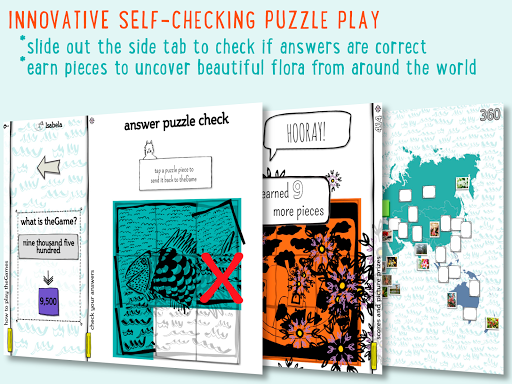 These apps showcase a unique multiple-choice game-play that allows the player to self-check his or her answers at ANY time - just slide out the answer puzzle tab!