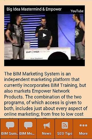 The BIM Marketing System is an independent marketing platform that not only incorporates BIM Training, but also includes the training products of Empower Network. The combination of the two programs, of which access is given to both, includes just about every aspect of online marketing; from free to low cost paid sources of traffic or lead generation, email marketing, list building, solo ads, video marketing, blogging and much more! For those that are just entering the online marketing space, the training will tremendously reduce the learning curve from perhaps years to months.