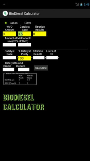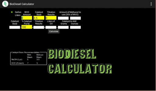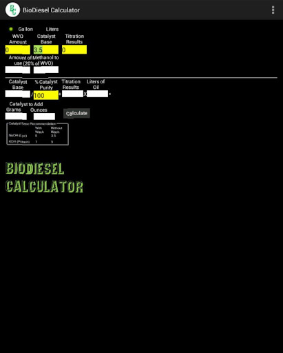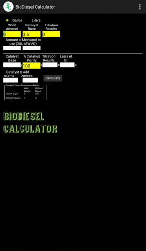 This app is for calculating the amount of catalyst and methanol needed for making a batch of biodiesel. It takes into account the amount of oil you will be using along with the base catalyst, titration results and the purity of the catalyst you are using.