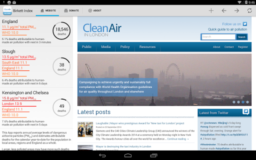 This App reports the health impact of long-term exposure to dangerous airborne particles (PM2.5) for the population in local areas, regions and England as a whole. The App estimates the number of deaths attributable to air pollution on a pro rata, calendar year-to-date, basis and the time to the next attributable death as well as displaying the percentage of total deaths attributable to air pollution. It does not estimate or display the number of actual deaths from air pollution or the risk for an individual. Users can also see estimates for total population-weighted exposure to annual average concentrations of PM2.5 in different local areas and/or regions relative to World Health Organisation guidelines and England as a whole