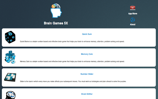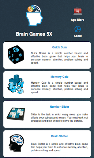 Brain Games 5X is a collection of five brain games, that are simple brain training tasks mostly involve planning, problem-solving and analysis. Here we need to develop mental strategies while playing. Brain Games are designed to continuously challenge mental performance and therefore maximise any benefits of training.