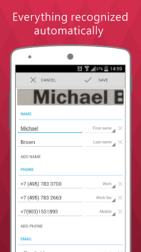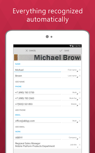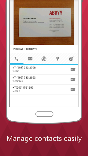 ✓ Forget having to manually enter contact details into your smartphone. Unsurpassed data recognition and speed based on famous ABBYY Mobile OCR technology, eliminate having to correct or re-key business cards data, making creating new contacts easy and automatic.
